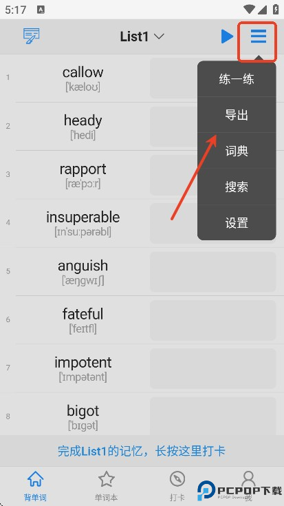 用户们可以点击右上角的菜单按钮,使用练一练,导出,词典等功能辅助记单词
