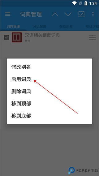 4、下载完成后点击顶部导航栏中的【词典管理】,在切换的页面中长按已下载的词典后选择【启用词典】点击