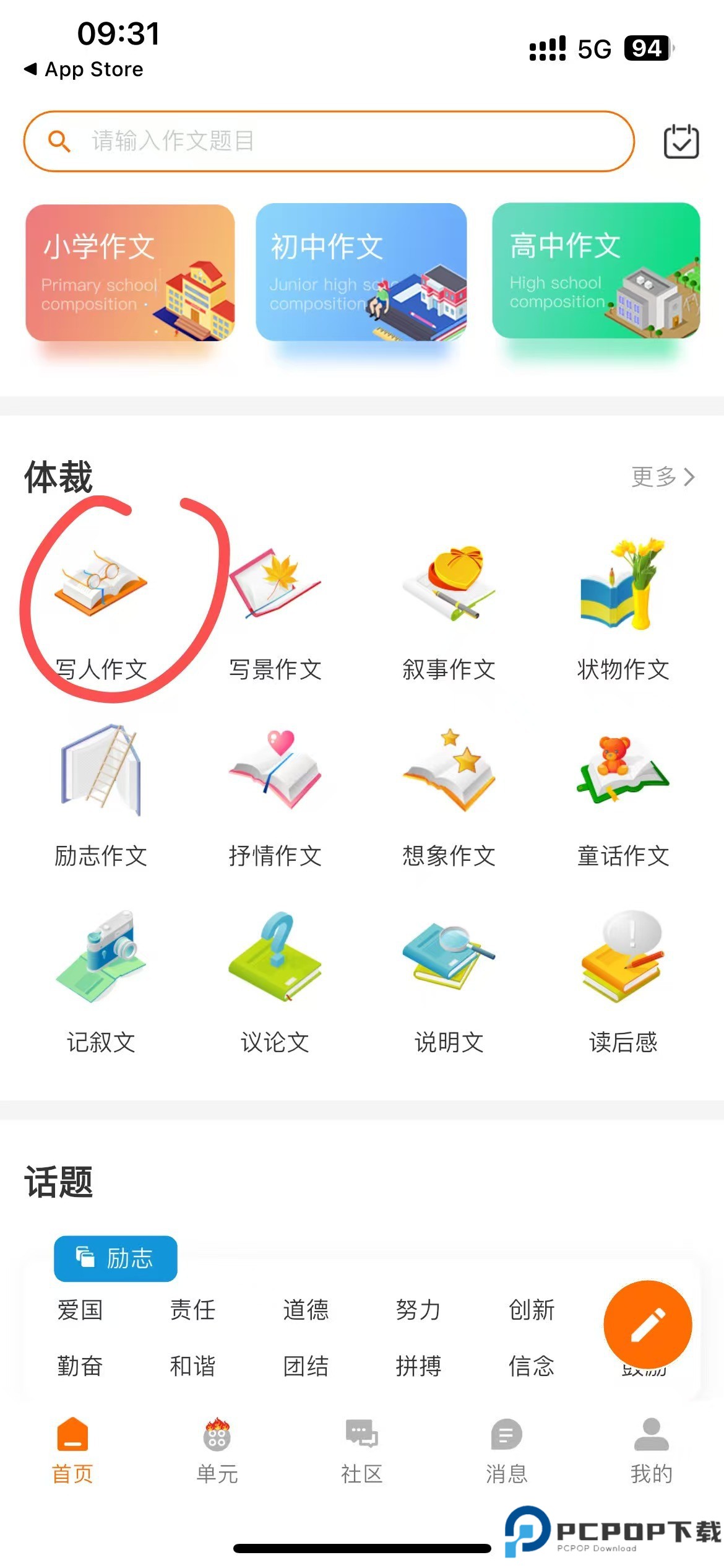 2、来到主页面,可以看见有许多功能,跟随小编的圆圈查看,点击写人作文,即可进行下一步。
