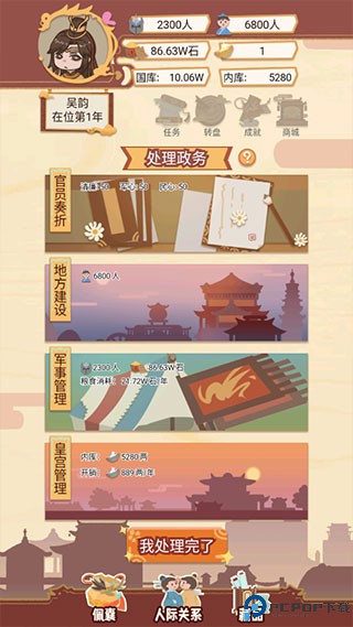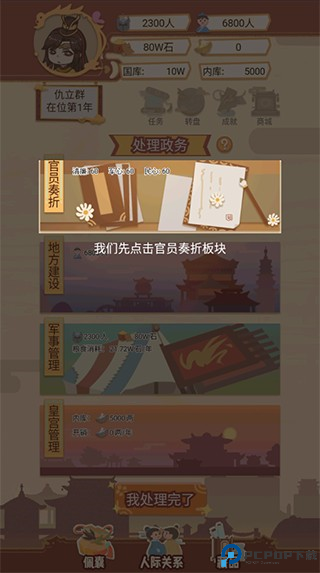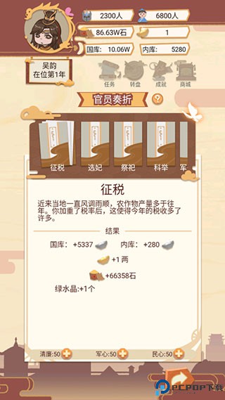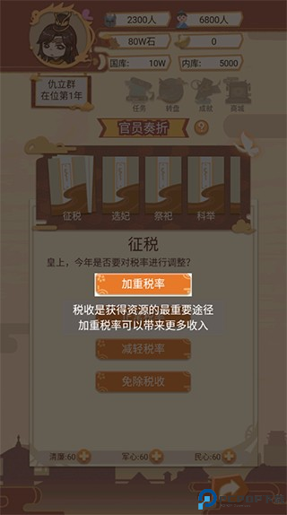 2、首先进入“官员奏折”处理政务,调整税率、推动建设获取资源。