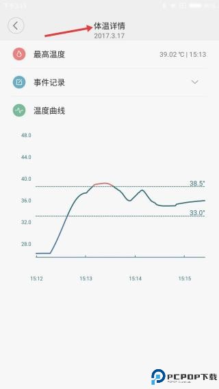 1、点击体温详情页,有日期、最高温度,呈现温度曲线,可查看体温变化历程。