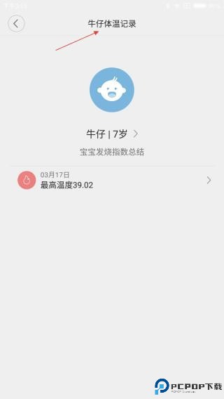 2、点击牛仔体温记录页,显示宝宝信息及发烧指数总结,明确最高温,关注健康状况。