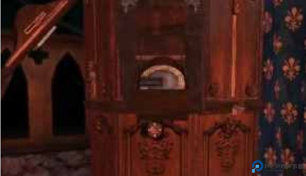12、来到中心的木桌上,放入金属公羊头,拿到雕刻的金属手柄,回到帘布的大木块头放入金属手柄转动。