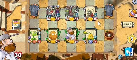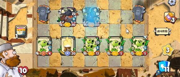 2、开局的话先正常开局,如果抽到三重豌豆直接放中间来做核心输出,后面只要不断给它加攻击并保证它存活就可以了。