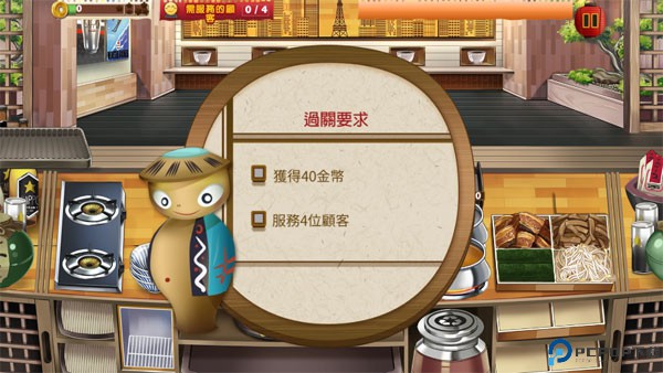 1、打开游戏点击play按钮,这时会弹出一个过关要求,了解到获取的金币数量和服务的顾客数量后,开始游戏。