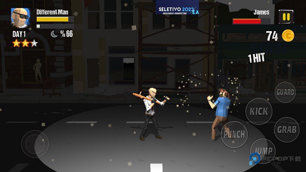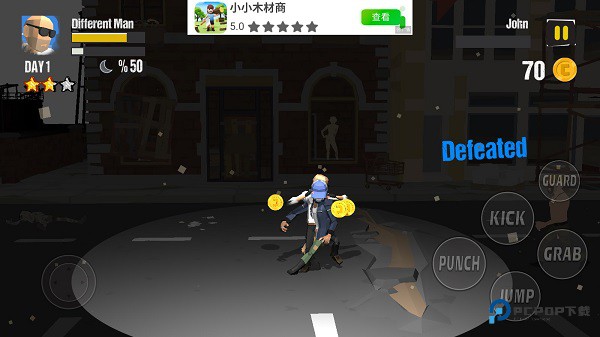 6、遭遇敌人时,点击右侧功能按钮发起攻击或回避:PUCH(拳击)、KICK(踢击)、JUMP(跳跃)、GRAB(抓取 / 投掷)。