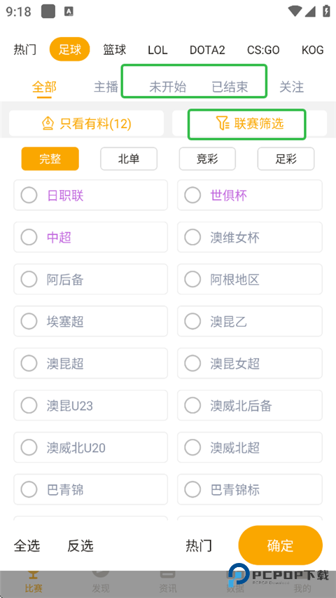 3、接下来嘛,页面上能看到比赛的不同状态了,想瞄还没开始的比赛就选【未开始】,要查结果看【已结算】的。当然啦,如果只想关注某个联赛,也别忘了利用筛选功能挑一挑。