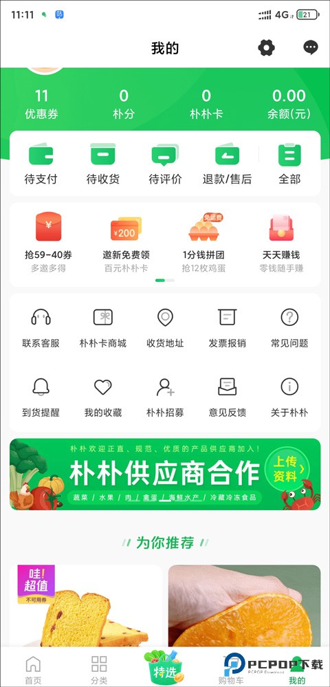 1、打开朴朴 APP → 底部「我的」 → 找到「发票报销」按钮。