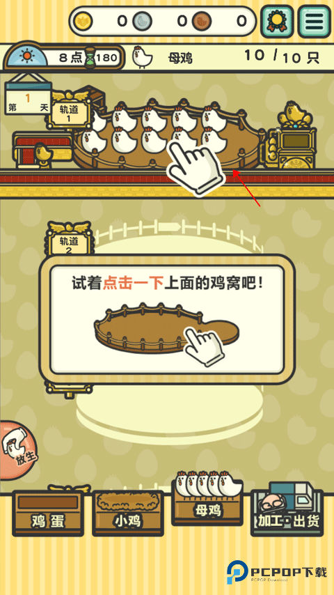 7、长大的小鸡成了新母鸡,点底部 "母鸡" 图标把它们送回主鸡窝,开启新循环吧。