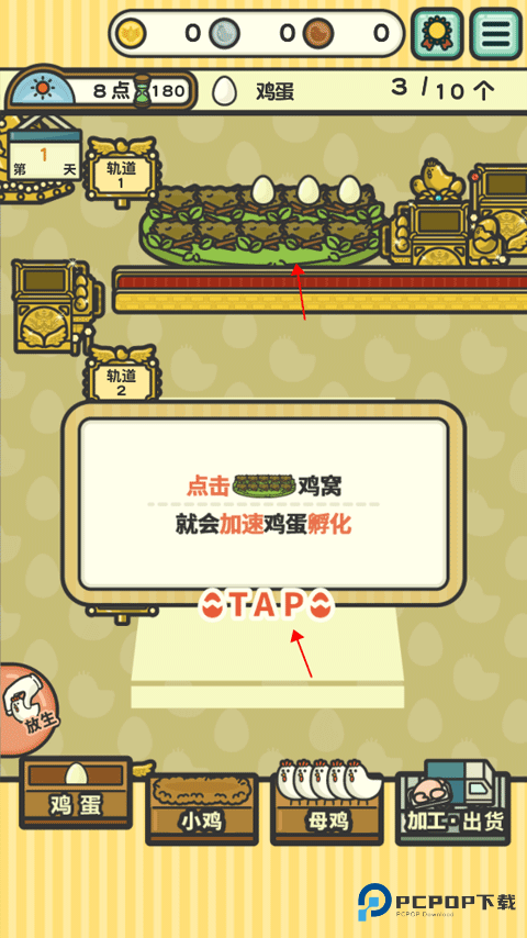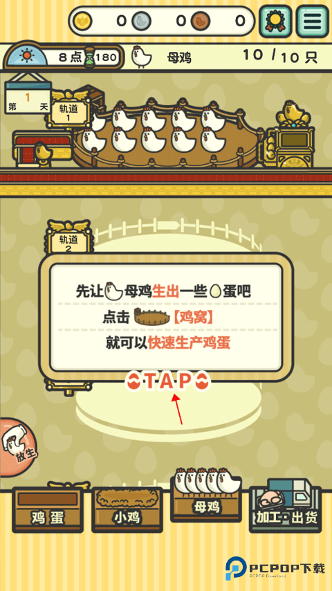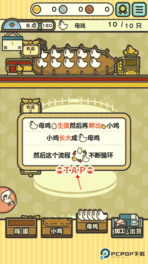 2、整个游戏循环超简单!母鸡下蛋→孵出小鸡→养大变成母鸡→继续下蛋,跟着这个循环走就对了。