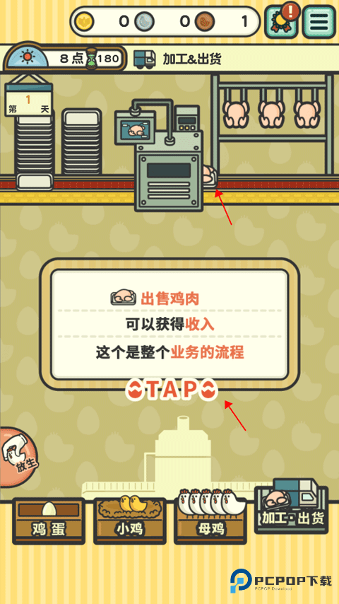 1、启动游戏后戳一下那个醒目的 "OK" 按钮,恭喜!你现在就是养鸡厂老板啦~跟着指引点 "TAP" 按钮正式接管工厂。