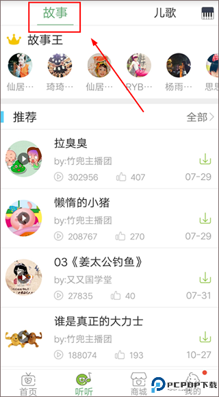 1、打开登录竹兜育儿app,点击首页下方【听听】