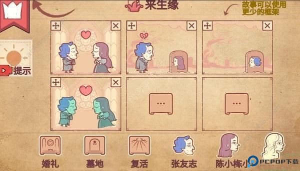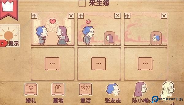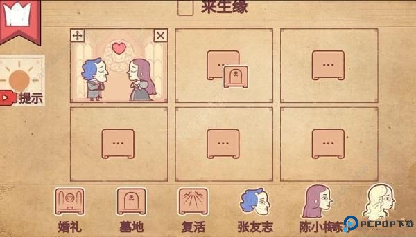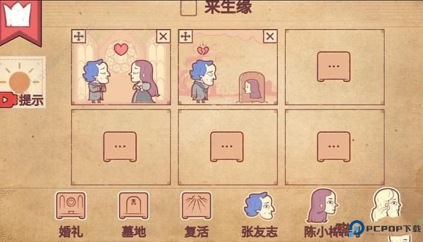 4、这时玩家就将婚礼放入第四个框,再将张友志陈小梅放入进去他们虽然变成了鬼魂,但是他们又相爱了然后就通关啦,如图所示。