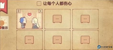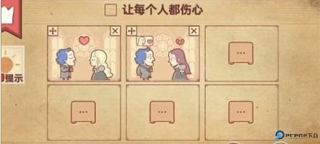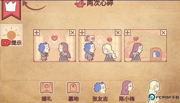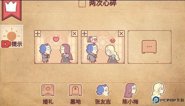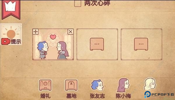 4、玩家先将婚礼放入第二个框框中,再将张友志和陈小梅放入第二个框框中,他们会心碎,如图所示。