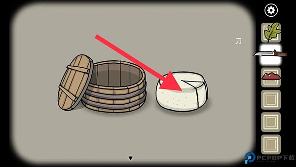 天堂岛内走右侧小道,茅草屋外获得【桶】,进入茅草屋,可以获得【刀】
