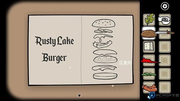 茅草屋桌子上,可以查看锈湖汉堡的食谱,记住食材的摆放顺序,进入天堂岛高塔顶部房间,利用桌子上的面包制作出汉堡。胖男人会吃掉汉堡。