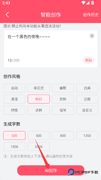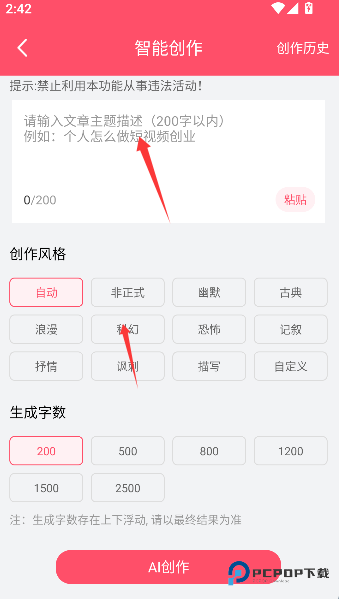 2、输入主题并选择文风,就像为这位编辑指定创作方向与笔墨风格,是写成诗歌还是写成报告。