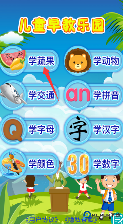 2、在内容列表中找到并点击标有"学蔬果"或类似名称的专题图标,进入蔬果认知学习模块。