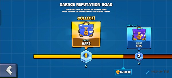 8、主界面左上角找到 CAR RACE REPUTATION 点进去,那里能领取宝箱。打开宝箱能获得各种物品,提升等级后还能解锁更多、更好的宝箱。