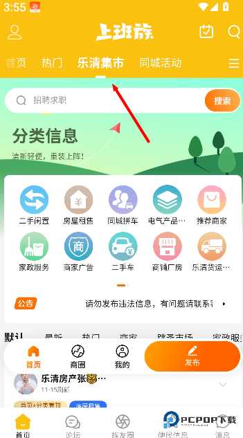2、点击进入“乐青集市”板块,查看分类信息入口及最新发布的物品或服务。