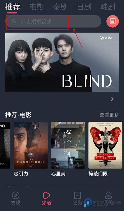 1、打开 App 进入底部 "频道" 页,顶部搜索框直接输入剧集全名或关键词。