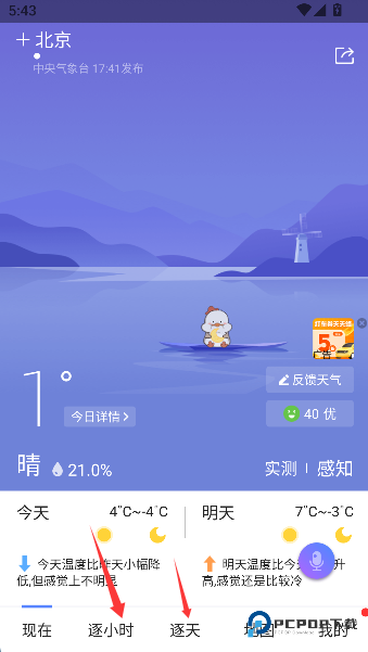 3、 按需求点击逐小时和逐天查看,就像打开了天气的预告片花絮,从下一秒的雨滴到未来的阳光,尽在掌握。