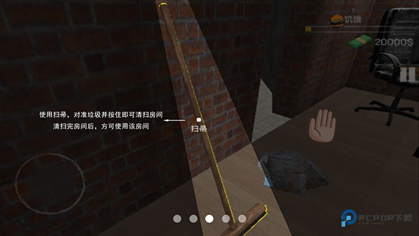 4、抓起扫帚工具,稳稳地把屏幕中心点对准地上的垃圾井盖标志,然后长按不松手,这样才算开始打扫。