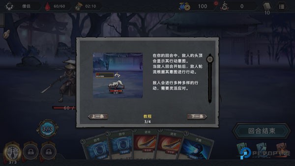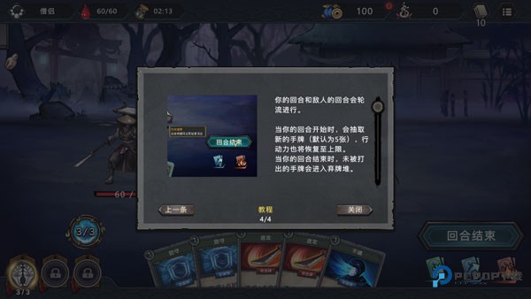 4、回合节奏要卡准:敌我双方轮流行动!到你回合时自动抽 5 张新手牌(可调整),行动力回满;回合结束没打出的牌全进弃牌堆。
