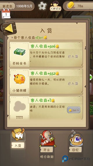 这是你的赚钱主战场!需要持续补充店里的各种货物上架出售。上货时需要一定的花费投入,但每种货物只需进一次货,数量不用操心补充。客人在店里时,手指点点他们就能赚到钱啦!商品种类特别丰富,全是很能唤起童年回忆的小玩意儿。