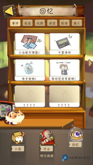 回忆系统收集各种怀旧物品,大致分了事件、食品、玩具、杂货、影音、顾客这几种类型。解锁方法很简单,通过进货新商品或者和客人互动点击就能逐步打开这些回忆片段。