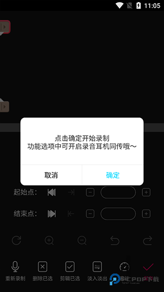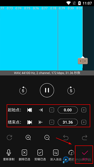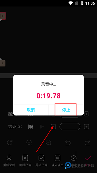 4、录制结束会跳转剪辑页面:觉得哪段不好?可以通过拖动滑动条选择剪辑区间,或直接在编辑框输入开始和结束时间。确定后点保存按钮,只保留你选中的音频片段,完美解决!