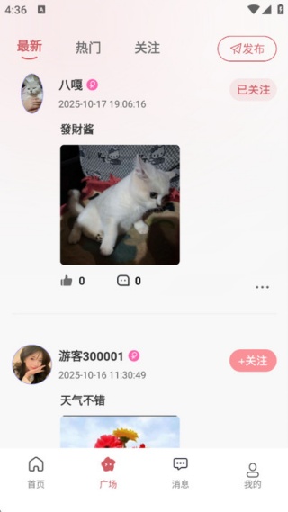2、在广场板块,浏览最新的动态,还有热门和关注模块,让您轻松发现感兴趣的内容和用户。