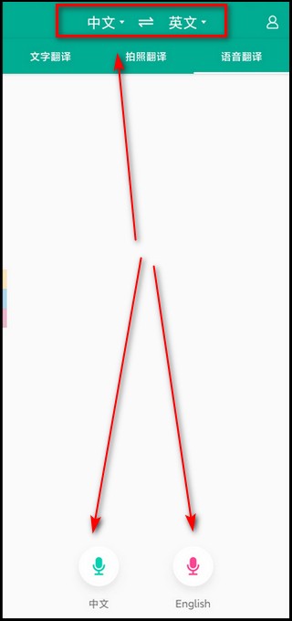 3、语音翻译:在这里分别有中文和你设定的另一个语言,按住任意一个按钮说话就好啦。