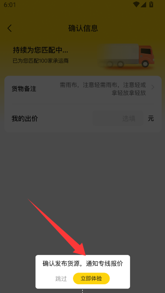 3、最后确认发布,这份满载期待的货源信息就像一张电子悬赏令,迅速出现在匹配的运输车队眼前。