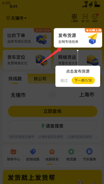 1、轻点“发布货源”按钮,就像登上了物流界的寻车大舞台,向全国的司机师傅发出你的货物召唤。