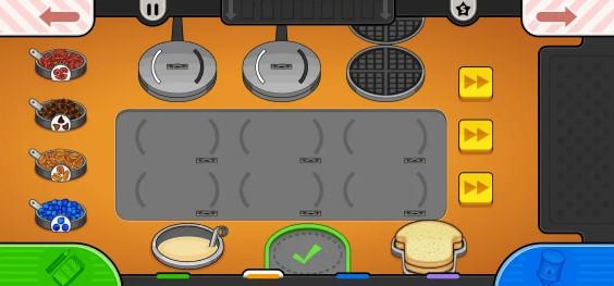 1、制作餐点的第一步是烹饪,玩家需要根据顾客订单,将面糊和/或吐司面包片放入煎烤台或华夫饼煎锅中烹饪,