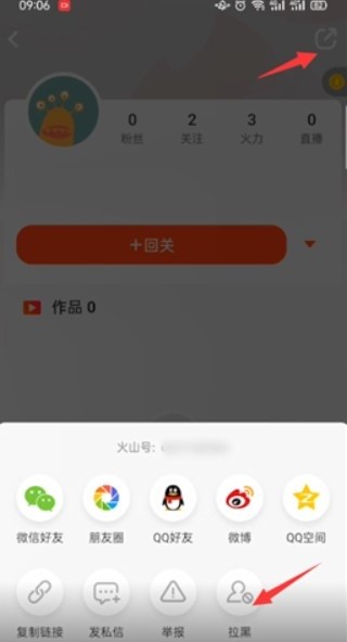 3、点击右上角的分享图标,即可出现拉黑,点击拉黑。