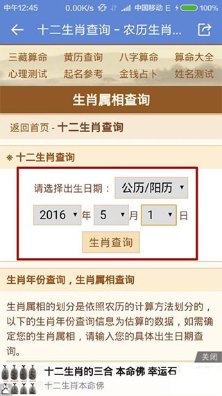 在常用工具中,点击生肖属相,进入查询界面;