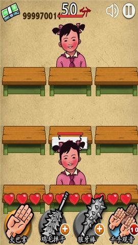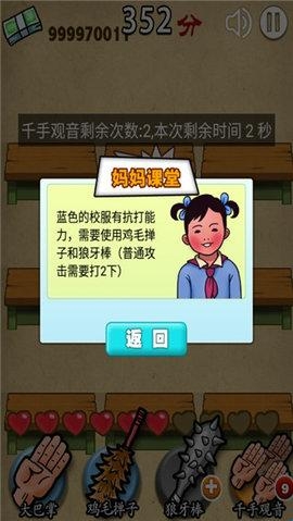 遵循打地鼠的玩法,通过击打随机出现的小朋友来获得积分和年级进阶,但有些小朋友所附带的道具会让你感到意外哦,切记要仔细观察后再打,同时鸡毛掸子、狼牙棒和千手观音等道具技能的加入,也让游戏更富特色,可玩性更佳。