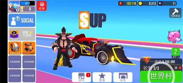 SUP多人赛车中文版是一款赛车竞速类手机游戏,以罕见的美式卡通风格与机制绚丽的画面色彩,给予玩家独特的视觉冲击,带动玩家驾驶赛车燃爆全场。SUP多人赛车的游戏玩法与传统赛车竞速类游戏玩法相似,玩家将在游戏中驾驶各式赛车冲向终点,但游戏增加的多种体型与碰撞力惊人的赛车将会让赛场上充满变数,新增的表情互动系统更是将玩家之间的碰撞拉向高潮,喜欢的玩家快快下载吧!