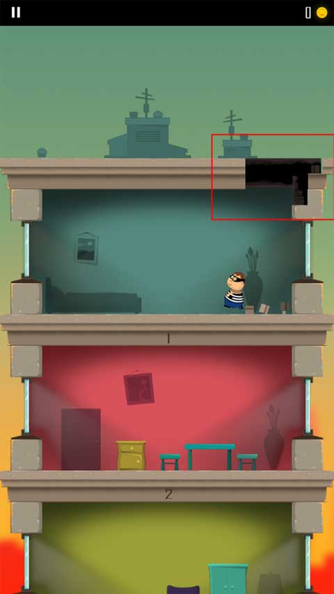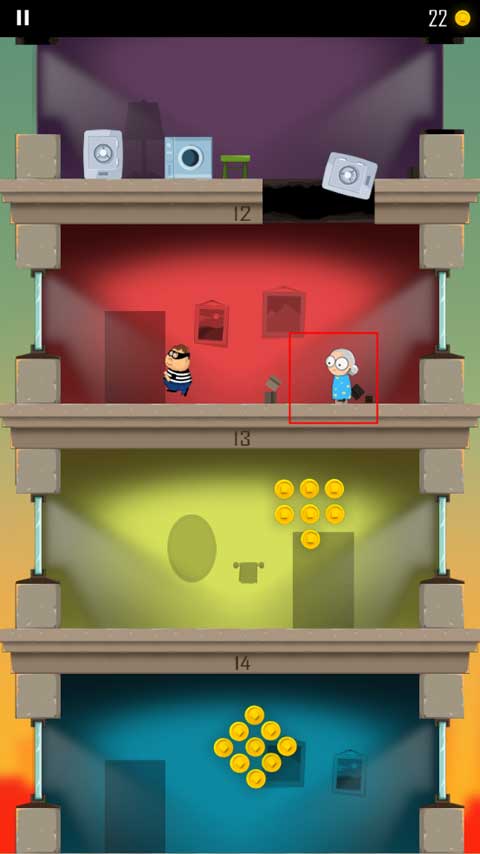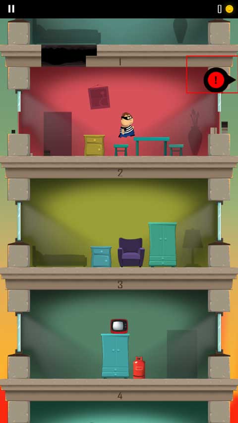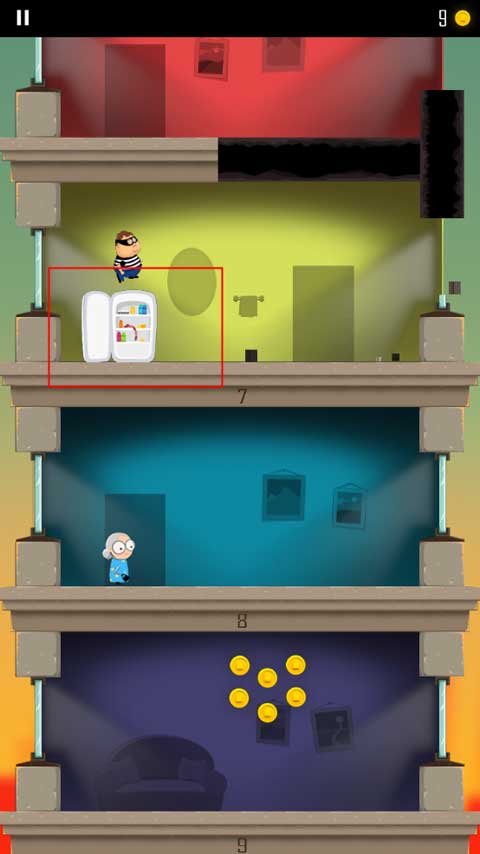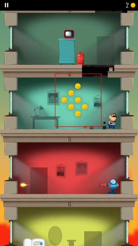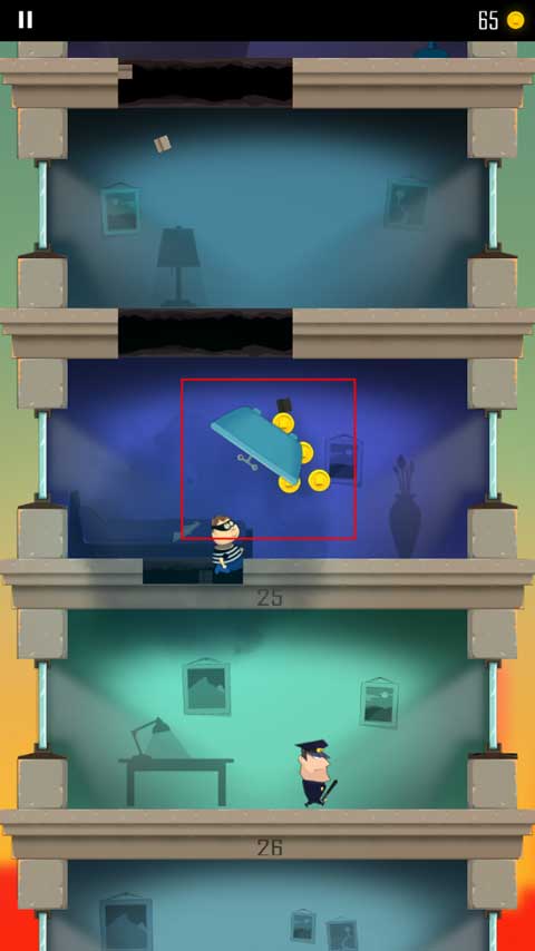 1、游戏开始会有一个小偷开始跑到另一层楼,玩家需要做的就是通过角色屁股着地的方式破开楼层,这样就能不断到达底下那一层了。