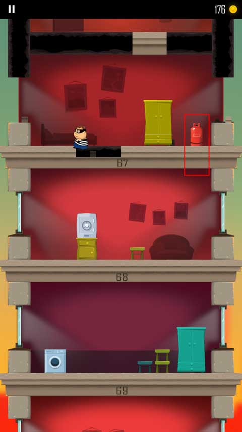 4、角色到达每一个楼层时,里面的东西都会不一样,有些是板凳、冰箱、煤气罐等,下面我为大家来介绍这些东西的作用,冰箱是类似护盾的功能,用来抵挡一次导弹、警察的攻击。