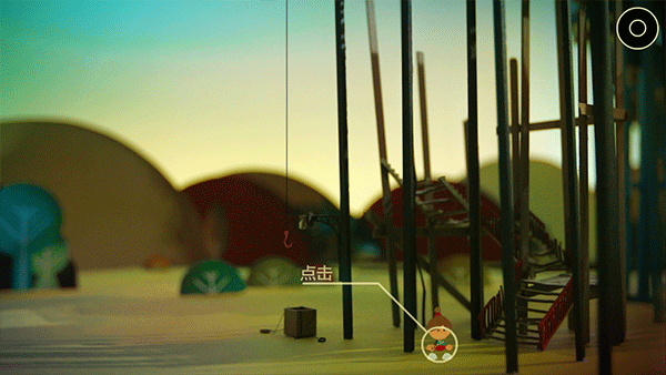 5、刚刚进入城市就遇到第一个关卡,卢米要从这个地方上去就必须从吊钩上去,捡起前方地上的小木棍放入包里,打开背包把木棍拖到铃铛的地方,敲响铃铛,上面的人就会把你吊上去;