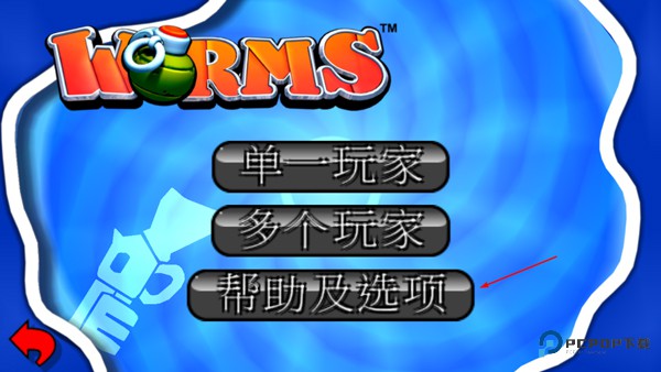 1、启动百战天虫手游,在主界面找到并点击 帮助及选项 这个按钮。