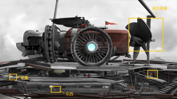 图中高亮的是机关,橙红色,所有图中都是这种颜色机关,由于人只能控制前后和跳跃动作,所以按钮基本就是顶,踩,推 这几种。能量液用于驱动后面的 房车(帆车)。能量液不直接叫燃料,因为它后面可以用来灭火,叫燃料有点违和。