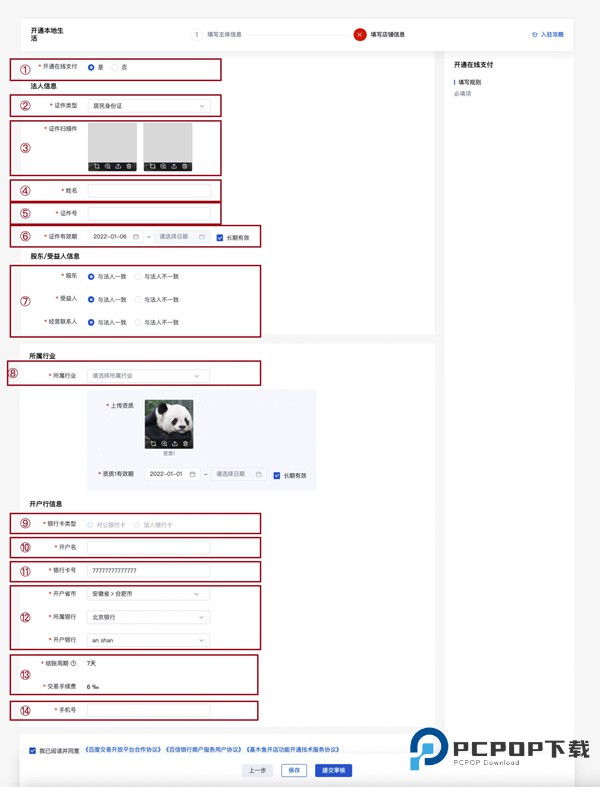 如果之后涉及收钱,需要绑定提现用的支付账户(开通在线支付才用到,入驻时可先不弄)。