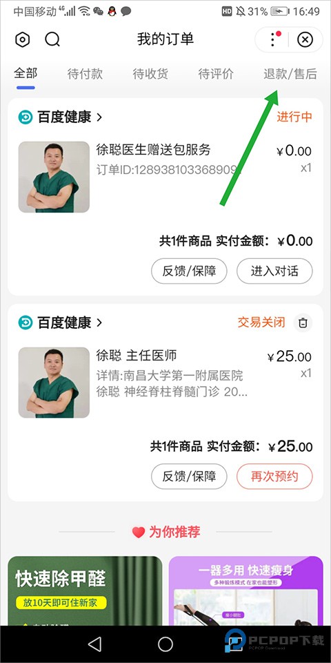 在这个导航栏里找到 【退款 / 售后】 按钮(通常带有一个类似箭头或循环的图标),点击它。这里会显示所有可以申请售后的订单。