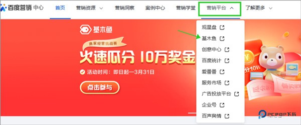 在电脑浏览器操作通常更方便:登录百度营销官网后 -> 看页面顶部的导航栏 -> 点 “营销平台” -> 在下拉选项里选 “基木鱼” -> 这就进入基木鱼操作后台了。