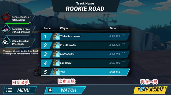 哎呀,刚才不小心摔了个大马趴,还啃了一嘴泥,结果拿了最后一名... 不过没事,比赛结束你能看到精彩(或搞笑)的回放动画回味一下,当然,也可以马上点 REMATCH 迅速重开一局,报仇雪恨!