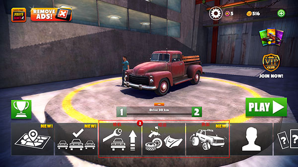1、进入游戏,开局拥有好车是个关键,下方可以将我们的车辆进行维修、喷漆和换新;